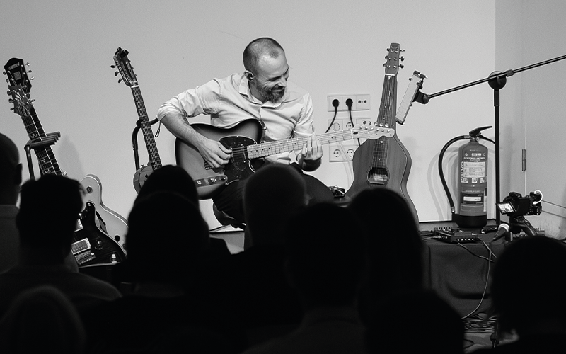 En mi adolescencia formé mis primeras bandas de jazz, participé en proyectos propios y di mis primeras clases. Después estudié el Grado Superior de Guitarra Jazz en Navarra, años de enorme crecimiento, conciertos, festivales y nuevos proyectos musicales.