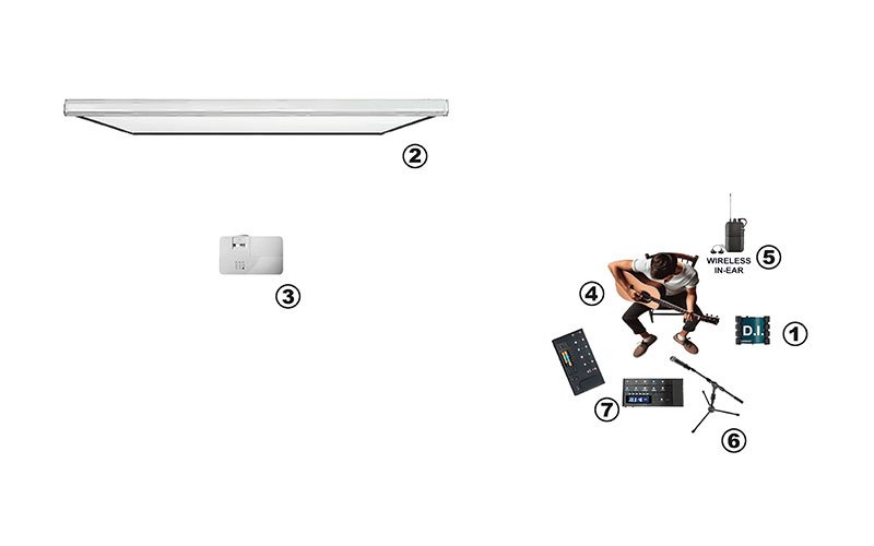 Los elementos marcados son suministrados por la organización a excepción del sistema de escucha (5) que es aportado por el artista así como los instrumentos y pedaleras.